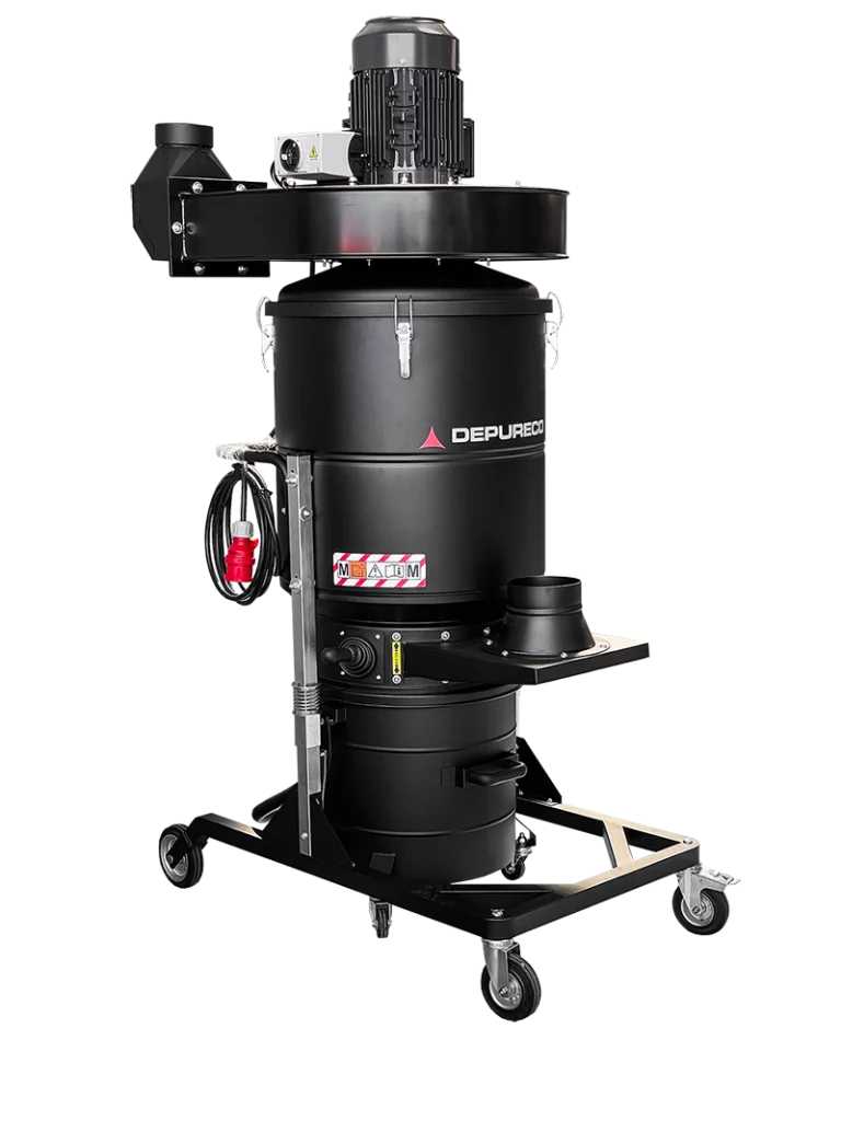El DF 40 es una aspiradora industrial portátil diseñada para la eliminación de polvo en suspensión o para su conexión a máquinas de corte de aluminio y PVC. Cuenta con un ventilador trifásico que proporciona una potente succión. Esta aspiradora industrial, que forma parte de la gama de aspiradoras Depureco, está equipada con un filtro de alta calidad que ofrece una eficacia de filtración de clase M de hasta 1 micra. De serie, la DF 40 incorpora un sistema de limpieza manual del filtro muy eficaz. Utilizando una palanca situada fuera de la cámara del filtro, el operario puede sacudir el filtro, haciendo que el polvo caiga directamente al recipiente de recogida. Además, si se solicita, se puede instalar un sistema automático de sacudida del filtro de pistón o un sistema de limpieza del filtro por impulsos de chorro.