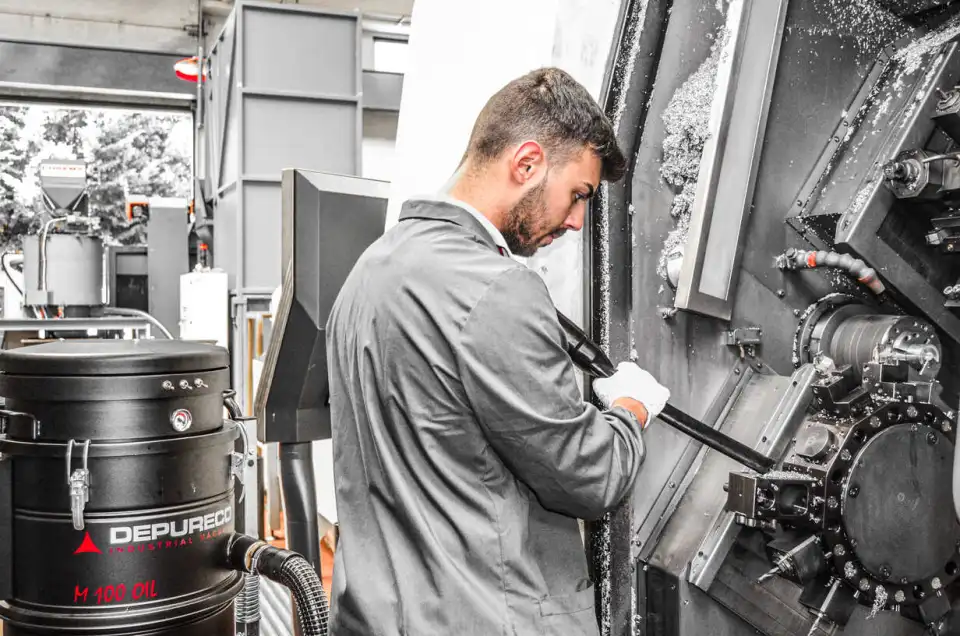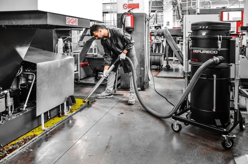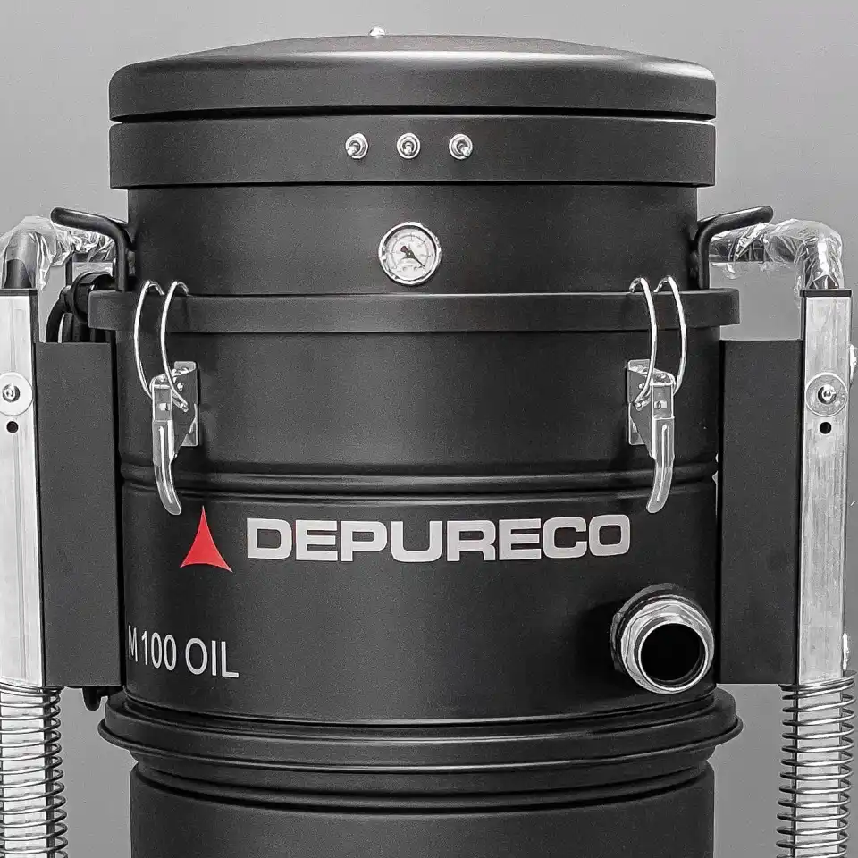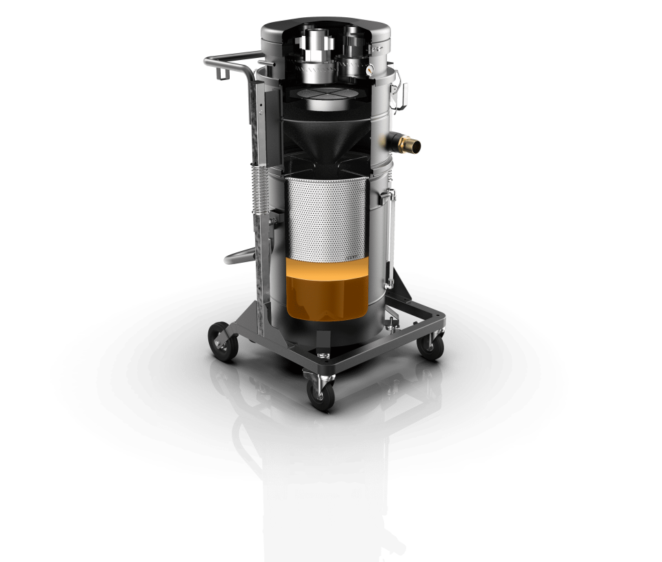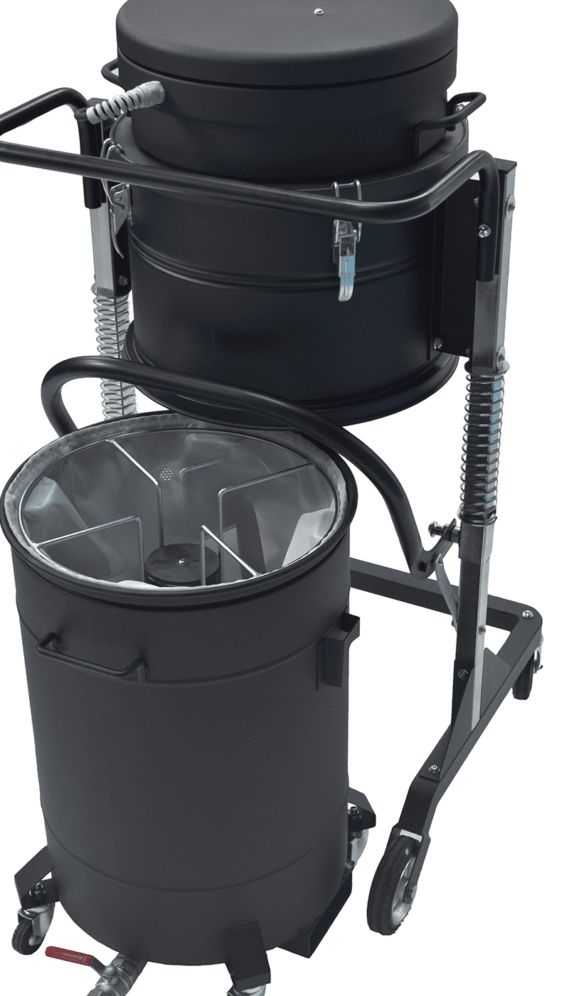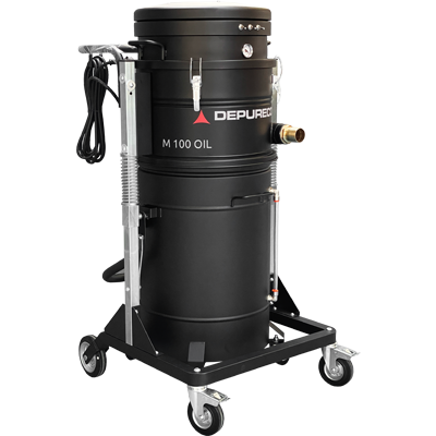 La aspiradora industrial M100 OIL está especialmente diseñada para aspirar y separar eficazmente el aceite y las virutas de depósitos, mesas y guías de máquinas de herramientas. Para garantizar una velocidad de aspiración excepcional, la aspiradora utiliza tres motores que funcionan en paralelo. El recipiente de la aspiradora está equipado con una cesta metálica que ayuda a separar las partículas sólidas del líquido. Para mejorar la filtración, incorpora un filtro de nailon de 150 micras. Para evitar el sobrellenado, el interruptor de nivel flotante detiene automáticamente el vacío cuando el recipiente alcanza su capacidad máxima de 26 galones líquidos de aceite emulsionado. En el recipiente hay un indicador de nivel externo que indica claramente el volumen de líquido que hay dentro de la máquina. La descarga se realiza a través de una válvula de bola manual de 1″ situada en el fondo del contenedor, utilizando la gravedad. La aspiradora industrial M100 OIL dispone de ruedas para facilitar su movilidad y puede elevarse con una carretilla elevadora, lo que simplifica el proceso de vaciado del material recogido. Esto permite verter el líquido en una colección de cubos de sedimentos.