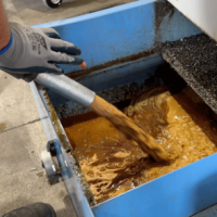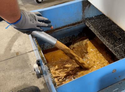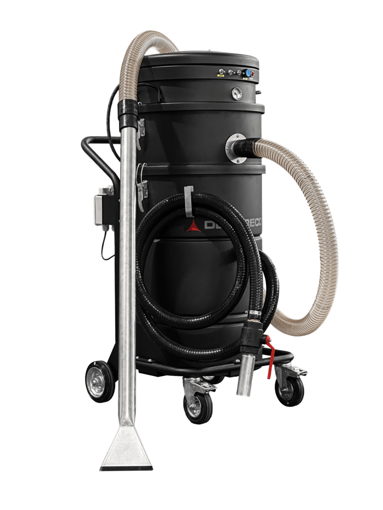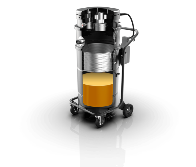 Para evitar el desbordamiento, la aspiradora está equipada con un interruptor eléctrico de nivel flotante que detiene automáticamente la succión cuando el recipiente alcanza su capacidad máxima (capaz de contener 70 litros de aceite emulsionado). Para facilitar la descarga, se emplea un sistema basado en la gravedad, utilizando un tubo de descarga situado en el fondo del contenedor. Si se desea, puede instalarse una bomba de descarga opcional al mismo tiempo que el proceso de filtración para facilitar la descarga del líquido.