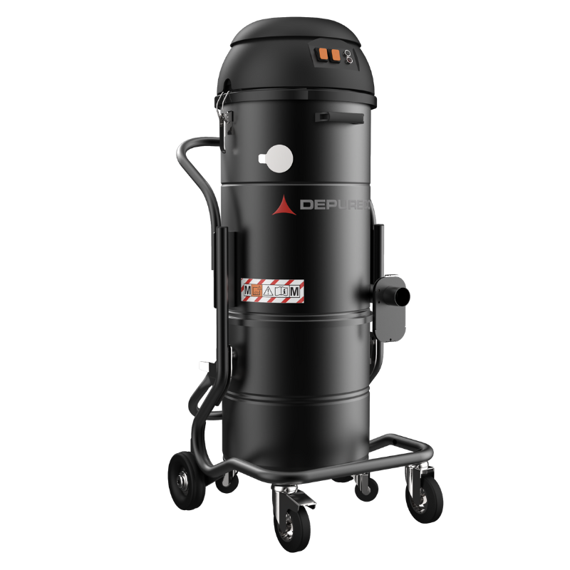 La aspiradora industrial monofásica de Depureco está equipada con el innovador sistema de limpieza de filtros JetClean®. Este sistema permite limpiar el filtro aprovechando la diferencia de presión entre el interior y el exterior de la aspiradora, todo ello sin necesidad de apagar los motores de aspiración ni desconectar el tubo de aspiración. Para mayor facilidad y seguridad, esta aspiradora está equipada con un contenedor desmontable de 12 galones de capacidad en la parte inferior, que permite desechar el material recogido sin esfuerzo.