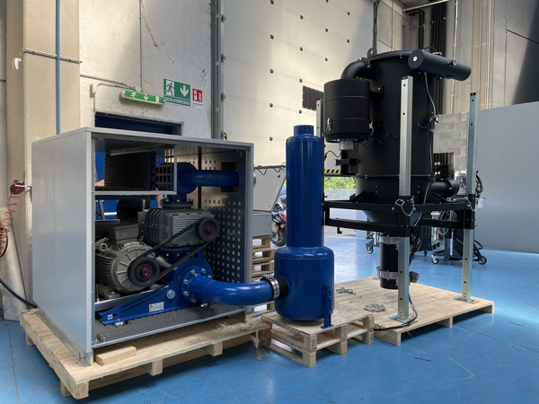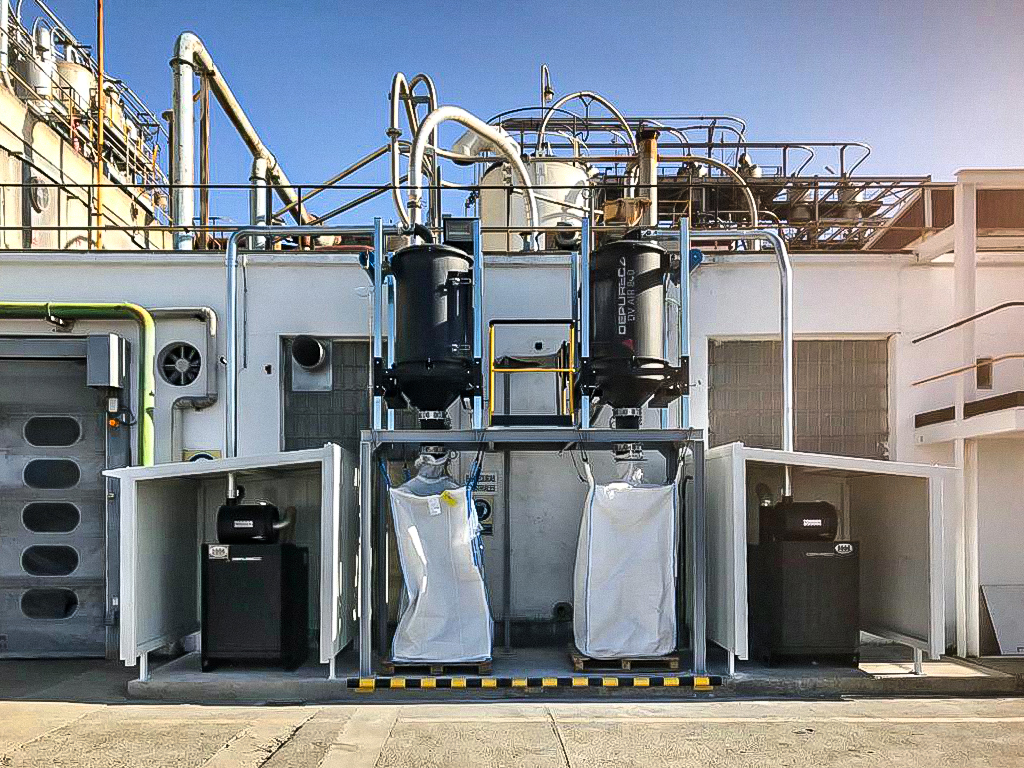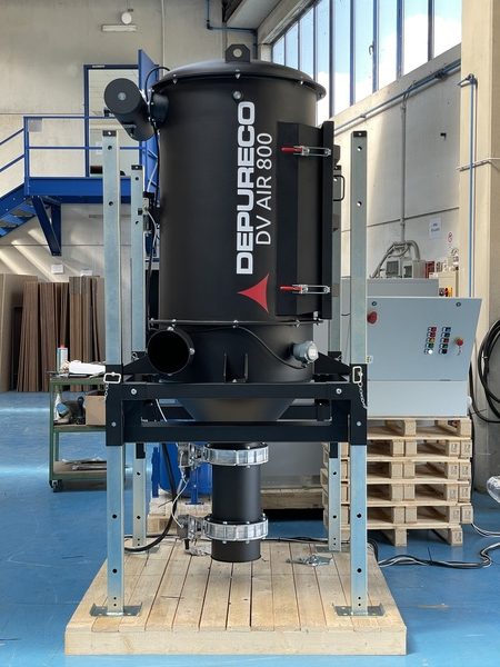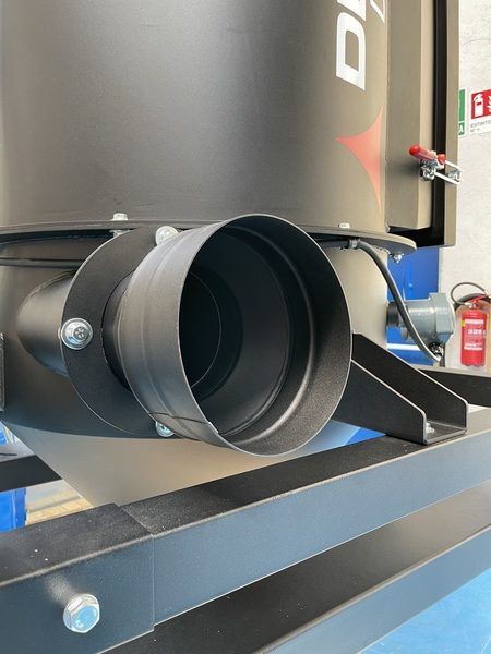 The DV-AIR features a reverse pulse jet cleaning system powered by compressed air (6 bar). Two independent, electrically controlled valves alternate to clean the filters, allowing continuous operation without downtime. This system is highly effective, particularly for capturing fine and challenging dust. Additionally, each cartridge is fitted with a protective sock to prevent granules and solid particles from getting trapped between the pleats, ensuring optimal filtration performance.