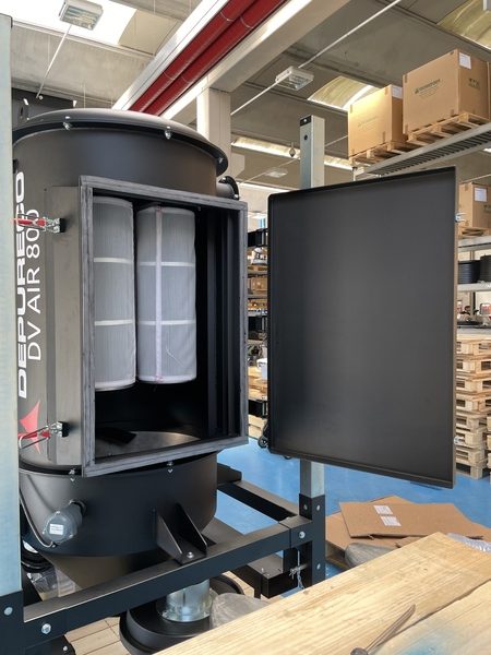 The DV-AIR is equipped with a central inspection door for easy access to the filtering cartridges. This design eliminates the need to remove the top cover of the chamber, streamlining maintenance and simplifying cartridge replacement and inspection.