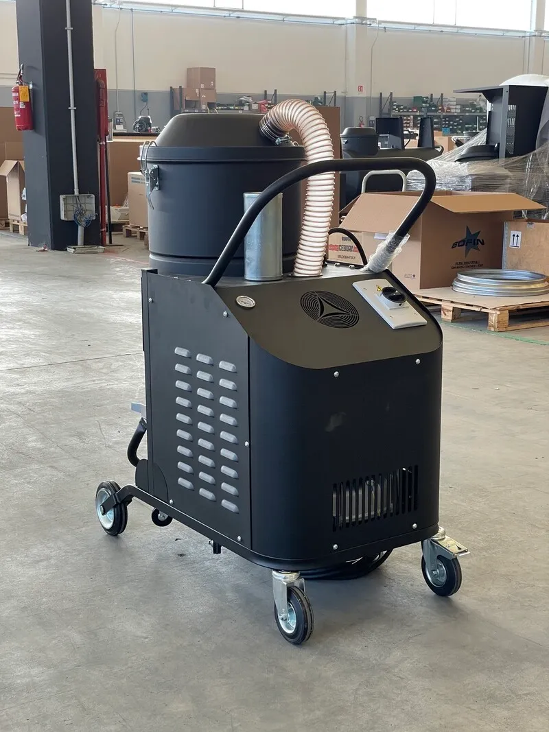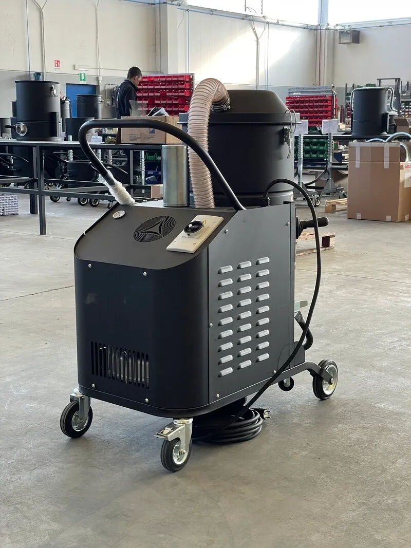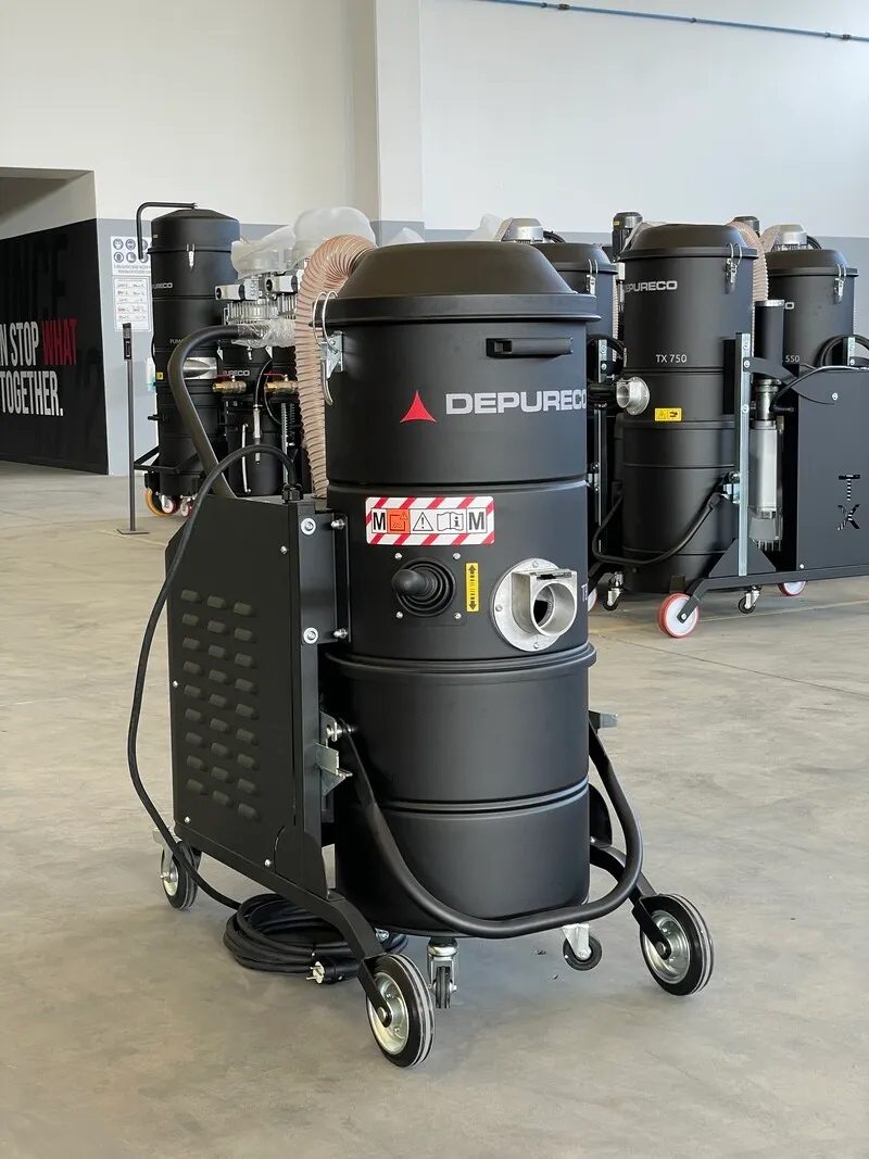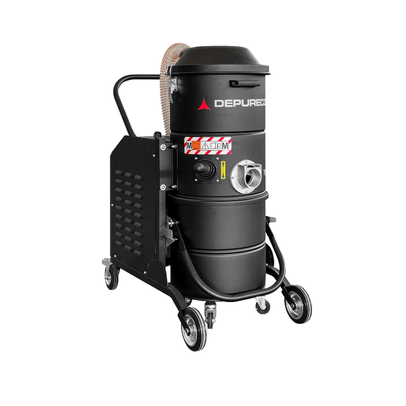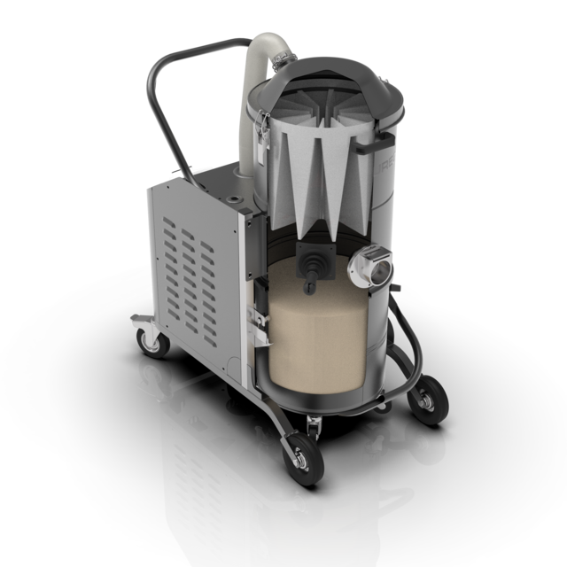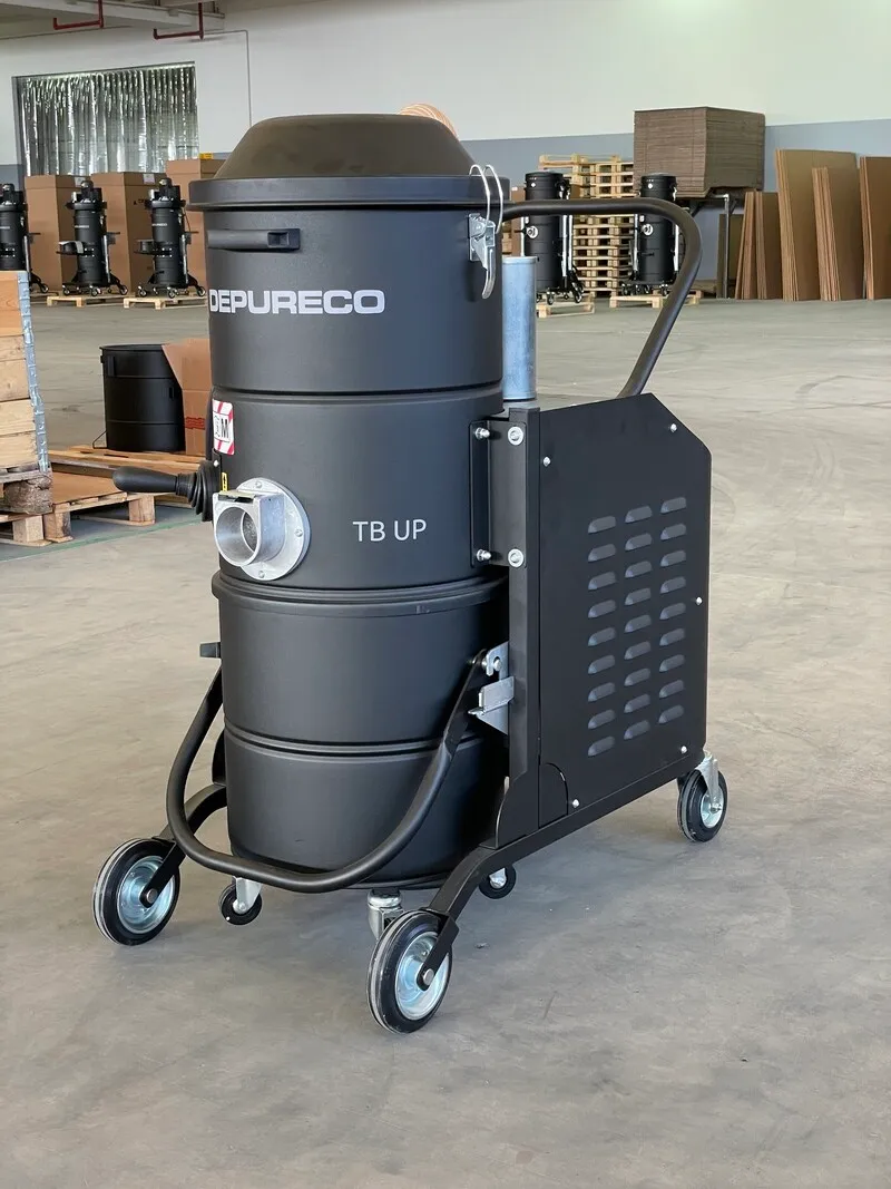 The TB UP is a compact industrial vacuum that comes with a side-channel turbine located at the rear, enclosed in a sturdy metal casing. It comes with a standard vacuum breaker safety valve installed in the turbine. The filter chamber houses a spacious polyester filter with M Class certification, ensuring an efficient filtration of even the finest dust particles. Depending on the specific professional application, alternative filters can be installed in this particular model from the Depureco three-phase range. Options include Teflon water-repellent filters, Nomex filters resistant to temperatures up to 482°F, and filters treated with PTFE for enhanced binding of challenging dust. Additionally, an H14 absolute filter can be added upon request. The TB UP industrial vacuum is equipped with a sizable 12 detachable container that is conveniently mounted on wheels, making it easy for the operator to empty the collected material. Disposable collection bags can also be used for added convenience. Furthermore, a floating system can be incorporated into the container to safely vacuum liquids.