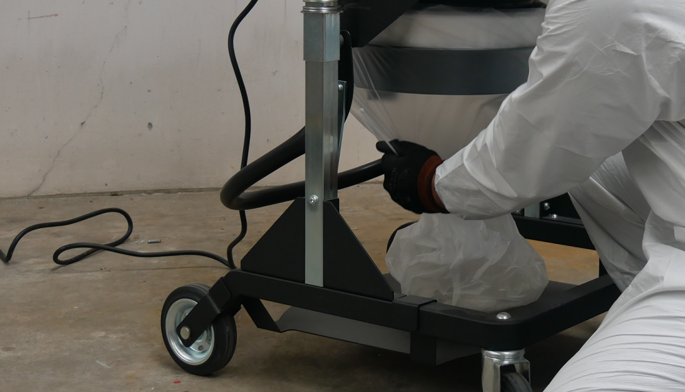 The gathered material is securely stored within a durable plastic bag known as Endless Bag. This bag, with a length of 787,402 in, is conveniently rolled up at the base of the filter chamber. When the vacuum cleaner is turned off, the collected material effortlessly descends into the bag. Once the bag reaches its capacity, the operator can easily seal it, cut it off, and safely store the accumulated dust. This process allows for a seamless transition to a fresh bag without any direct contact between the operator and the collected material.